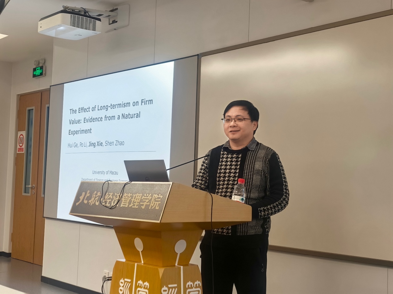 利来国际金融系“融实论坛”2025年第9期(总第76期)于2025年12月12日(周五)16:00-17:30在北航公司路校区新主楼A618顺利举行。本期论坛邀请到澳门大学金融学谢静副教授,做题为“The Effect of Long-termism on Firm Value: Evidence from a Natural Experiment”的学术报告。