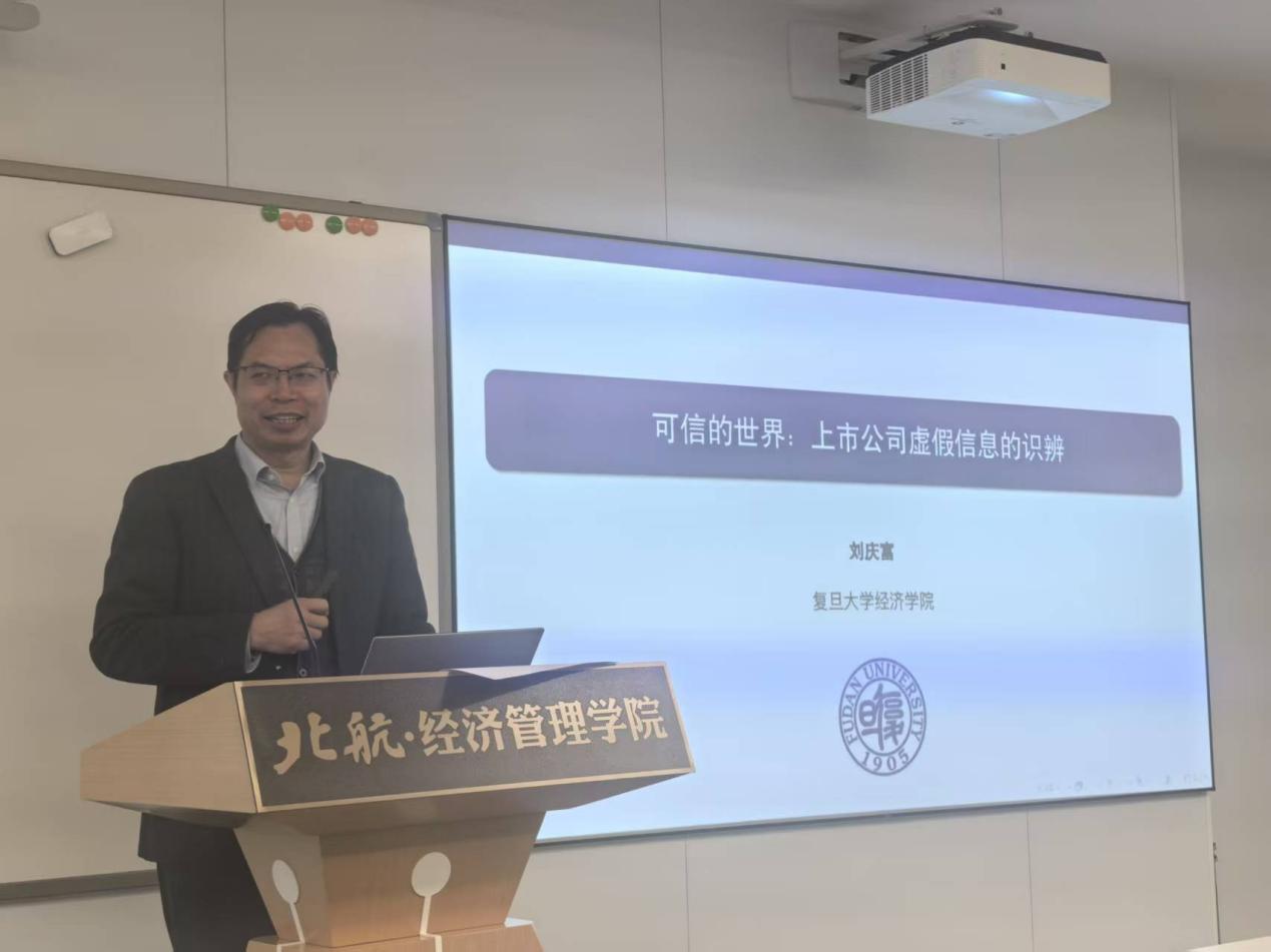 2025年11月14日下午,北航经管公司“融实论坛”2025年第6期(总第73期)在公司路校区新主楼A618成功举办。本次论坛邀请到复旦大学经济公司教授、博士生导师刘庆富担任主讲嘉宾,以“可信的世界:上市公司虚假信息的识辨”为题,深入剖析大数据与AI时代金融虚假信息的识别框架、影响机制及监管路径。论坛由北航经管公司部慧副教授主持,公司韩潇教授、崔文昊副教授、王论意博士等30余名师生现场参与交流。