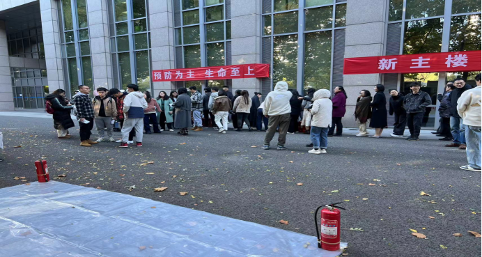 员工撤离到新主楼楼下后,总指挥喊话:“各副组长整理队伍,分别检查男女生人数是否准确,将情况报告给总指挥曹明。”