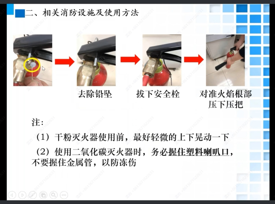 培训会上,杨硕老师从寒假期间实验室相关安全管理注意事项、实验室消防设施使用、灭火器操作、遇火情如何正确报火警、实验室内常见的消防隐患等方面做了细致的讲解。