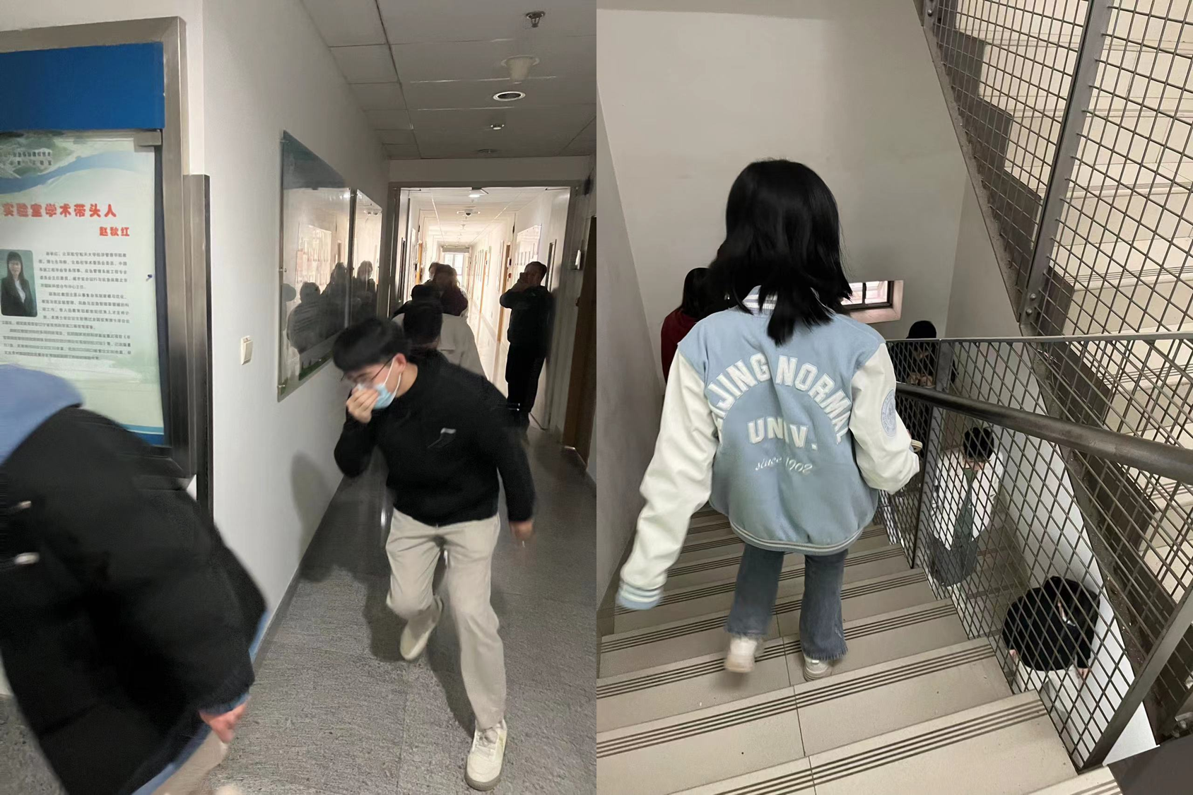 员工撤离到新主楼楼下后,总指挥喊话:“各副组长整理队伍,分别检查男女生人数是否准确,将情况报告给总指挥曹明。”