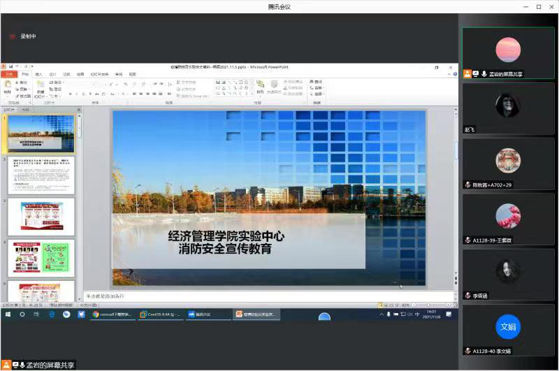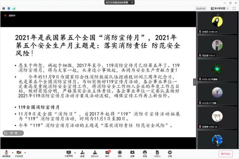 为贯彻落实公司《关于开展消防安全专项检查的通知》相关要求,强化消防安全宣传教育培训,经济管理实验中心结合“消防宣传月”广泛开展消防安全宣传,于11月6日下午以线上形式组织各实验室的员工开展了一次消防安全警示教育培训,培训会由杨硕老师主讲。