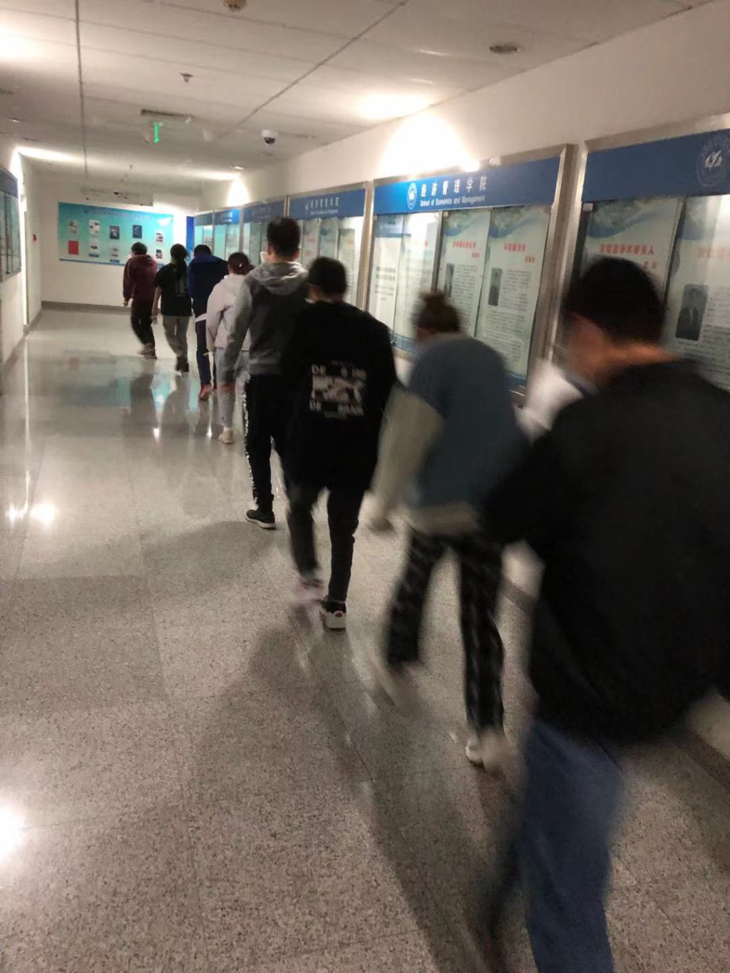 (4)员工撤离到新主楼楼下后,总指挥喊话:各副组长整理队伍,分别检查男女生人数是否准确,将情况报告给总指挥曹明。