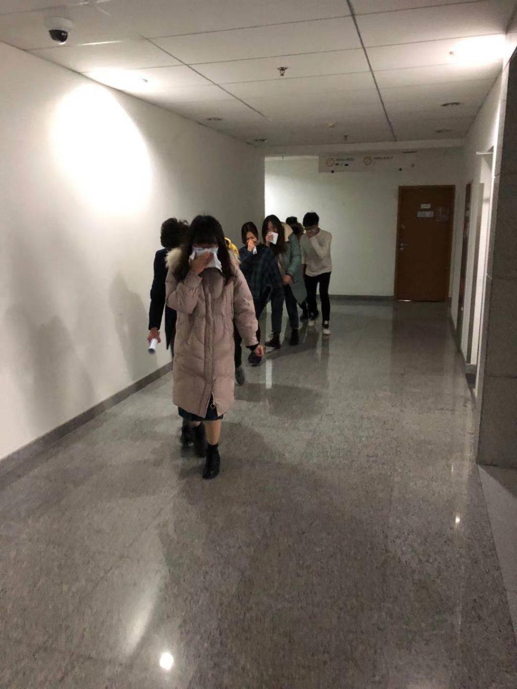 (5)员工撤离到安全场所后,总指挥喊话:各副组长整理队伍,分别检查男女生人数是否准确,将情况报告给总指挥曹明。
