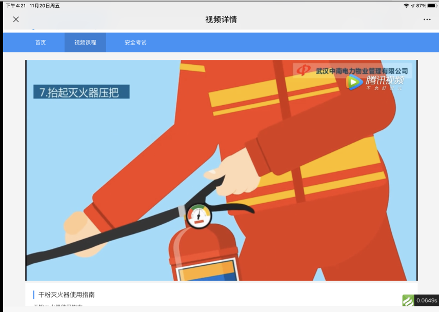 公司实验中心积极响应公司的号召,组织开展一次消防安全在线培训+考试。所有员工的观看视频培训截图+考试的截图统一由实验中心收集作为消防安全的培训考核记录,具体活动内容如图所示: