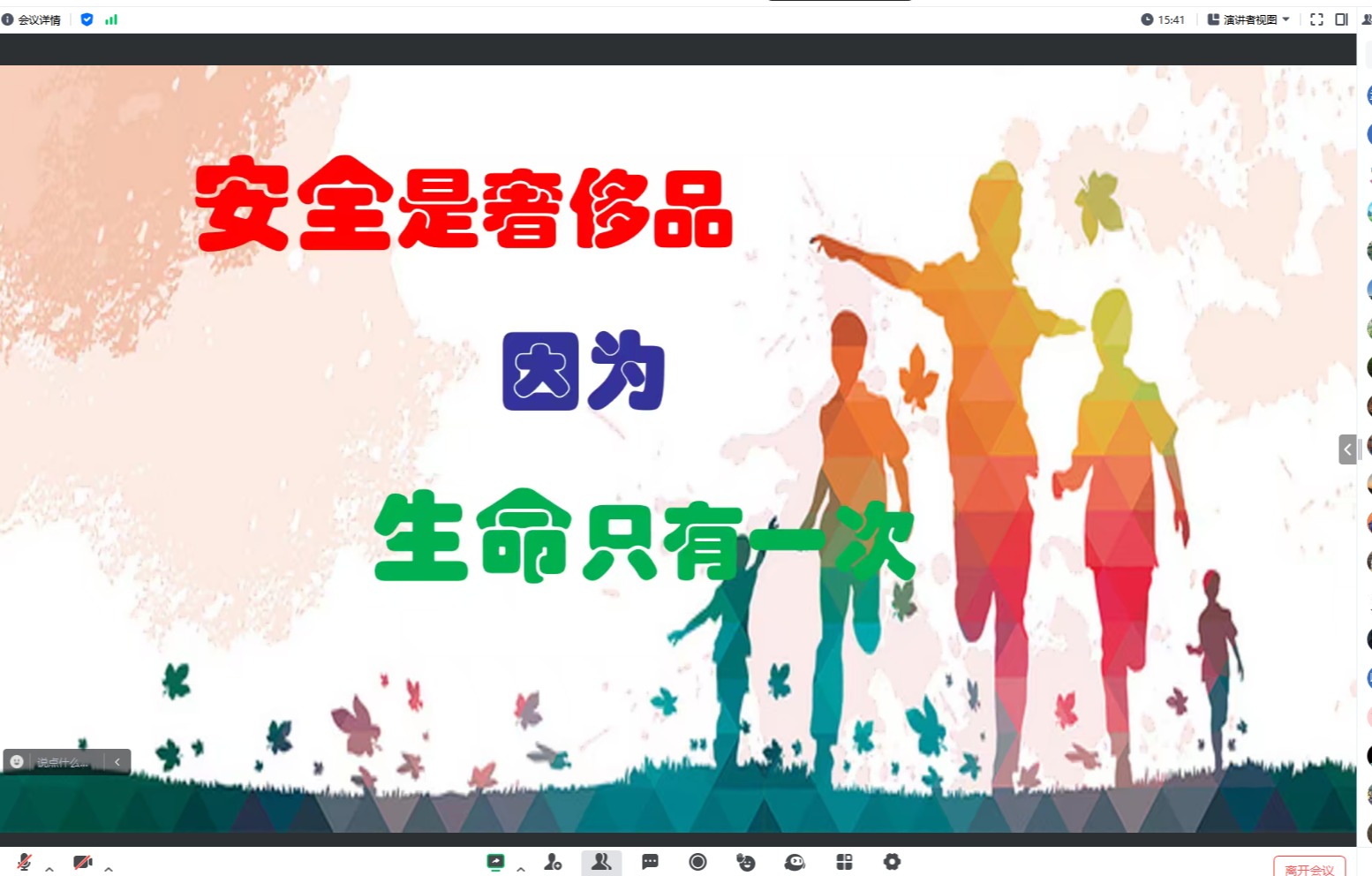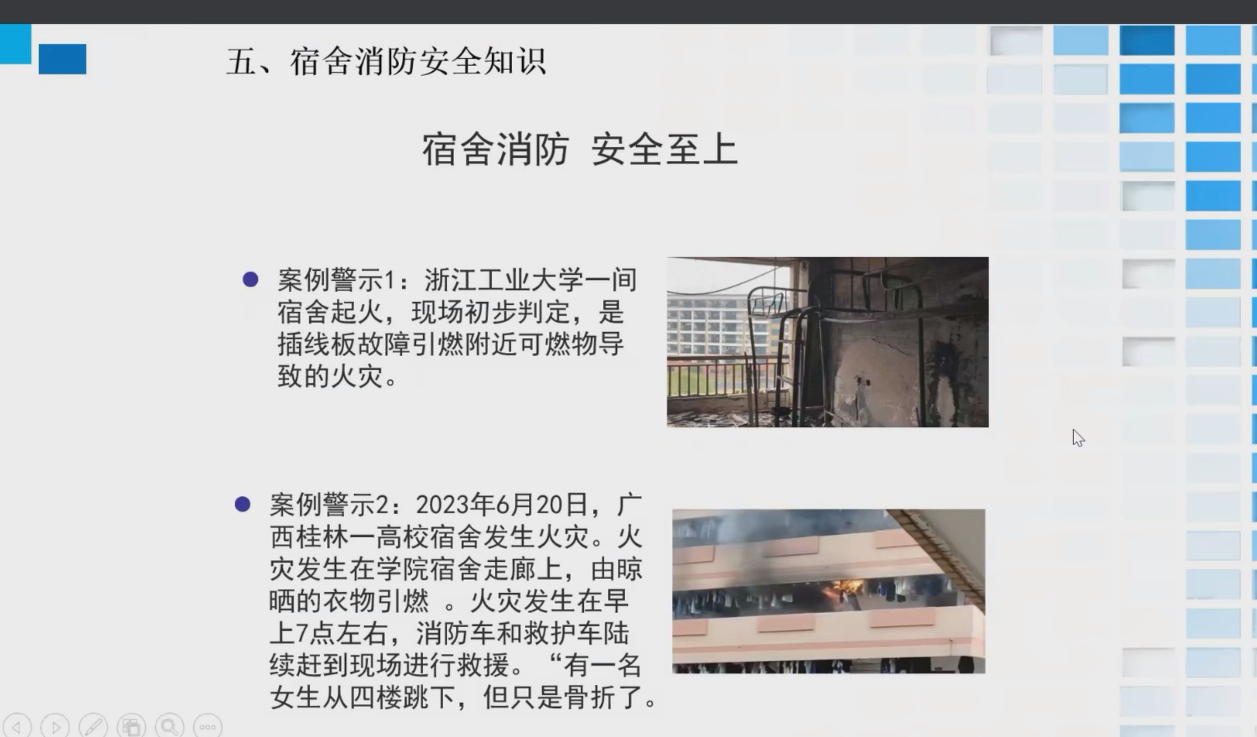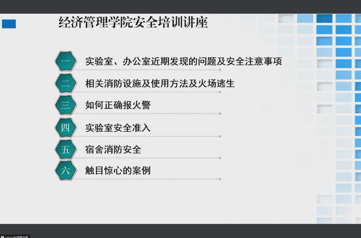 为进一步巩固师生消防安全意识及培养安全习惯,培育紧急逃生自护自救的能力,共建安全、稳定、和谐的校园环境,本着“安全第一,预防为主”和“以人为本”的理念,公司于2024年5月7日上午10点,通过在线腾讯会议形式为全院师生进行安全教育培训,此次培训由实验中心副主任曹明老师主讲。