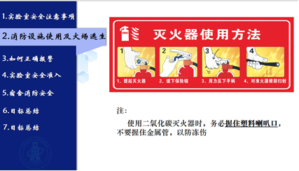 曹老师结合一些实际案例,就实验室常见火灾危险隐患、常用灭火器的种类和使用方法,如何报火警,以及火灾事故中逃生的方法为大家进行详细讲解。
