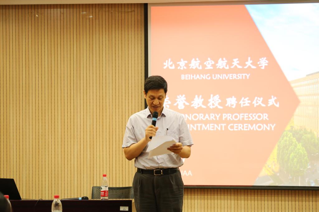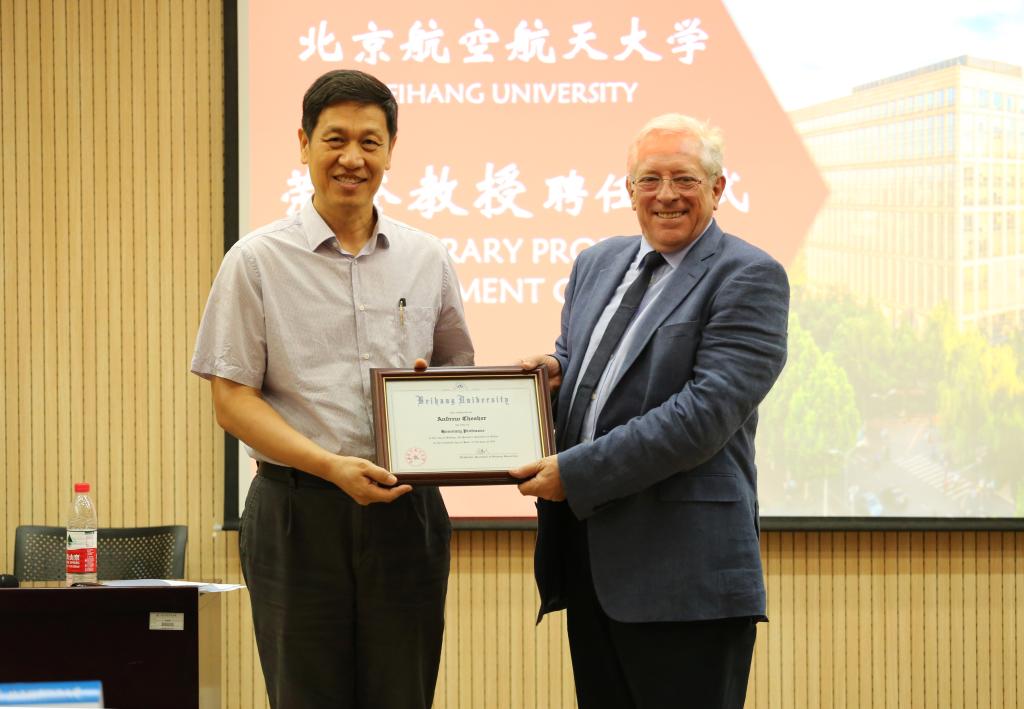 董事长徐惠彬院士代表公司致欢迎辞,并为Andrew Chesher教授颁发北航荣誉教授聘书 。