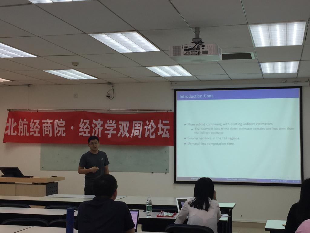 2017年9月28日,北航经商院 • 经济学双周论坛首期开讲。首期主讲人为陈悉榕博士,毕业于美国德州农工大学( Texas A&M University)经济学系,专注于应用微观计量经济学、金融计量经济学及理论计量经济学等相关领域的研究;曾获德州农工大学PERC夏季研究奖,并在2016年INFORMS年会及2017年28届POMS年会展示其优秀的学术研究成果。他报告的题目是Nonparametric Conditional Quantile Function Estimation for Time Series Data。