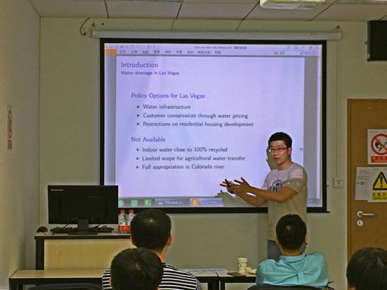 2018年4月27日,北航经商院•经济学双周论坛迎来了2018年春季的第四期讲座。此次主讲特别邀请到了北航经管公司青年教师钟铧副教授,其于美国肯塔基大学获得农业与资源经济学博士,后在美国内华达大学经济系任博士后,一直专注于环境与资源经济学、一般均衡模型等相关研究。目前研究项目为公共水利设施的福利影响分析。此次报告题目是“未(无)雨绸缪:水利设施投资的福利分析”,着重研究分析水利设施投资对于城市发展的影响和居民的福利分配问题,基于一般均衡理论,描述了水资源是如何影响并制约区域和城市的经济发展,以实证模型模拟并计算了美国拉斯维加斯城市水利设施的经济效益和福利分布。