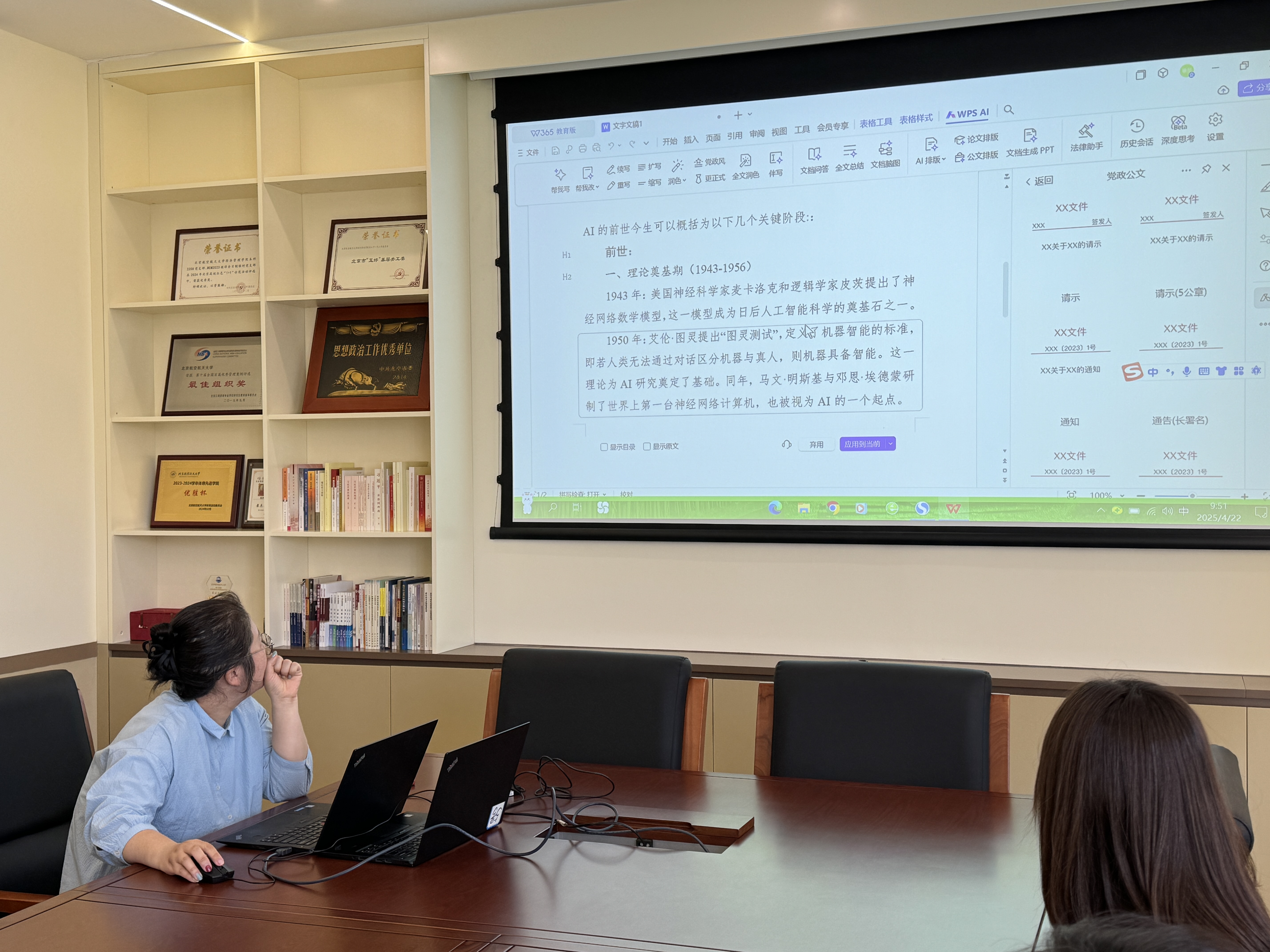 为响应公司“数智赋能年”行动号召,提升行政事务办事效率,研究生教务办公室于2025年4月22日上午在新主楼A612会议室进行了一场主题为“解锁WPS AI办公助手”的培训。本次培训由研究生教学秘书盛穆彤担任主讲,研究生教务办公室全体成员参加。