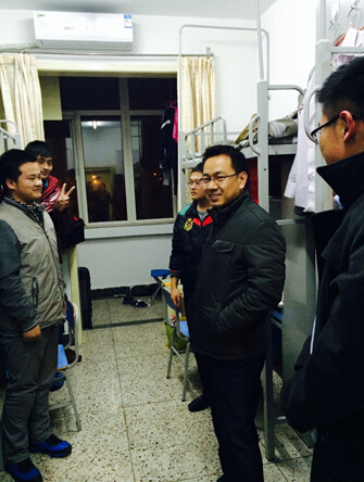2014年11月26日晚20:00,经济管理公司党委副书记王喜忠老师赴沙河校区男生寝室对14级员工进行期中考前慰问,辅导员石晓倩和闫琦陪同。