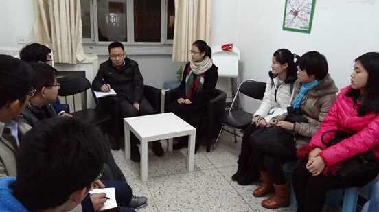 2015年5月19日星期二下午四点半,经管公司党委副书记王喜忠老师与1408部分同学在沙河校区实四106会议室开展交流会,闫琦与胡杰辅导员出席交流会。