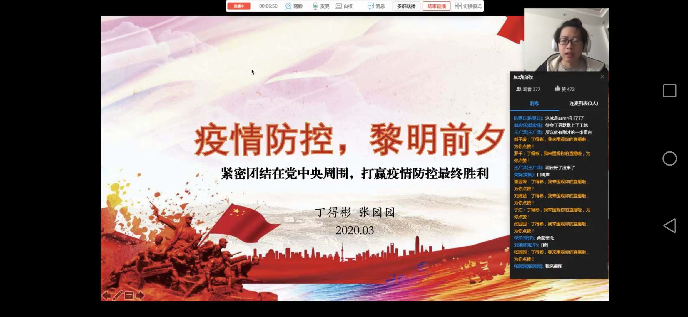 1808大班2020年春季学期第二次大班会顺利举办2020年3月18日15:00,1808大班2020年春季学期第二次大班会顺利举办。本次大班会采取钉钉线上直播形式开展,大班会由辅导员丁得彬和辅导员张园园主持,主题是疾病防控·黎明前夕,1808大班全体同学参加了此次班会。 班会开始,针对前期调研中了解到的员工对疫情形势认识不到位、员工之间缺少沟通等问题,辅导员丁得彬和张园园对公司的疫情防控的相关政策进行解释...
