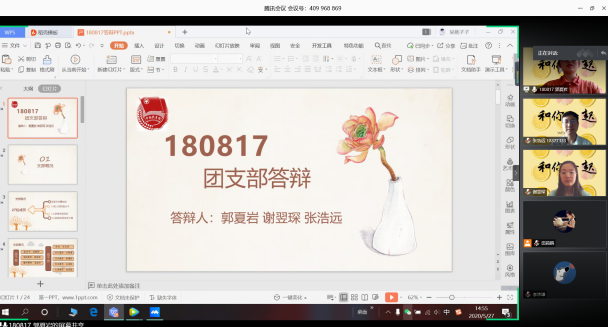 1808优秀团支部答辩顺利举办 2020年5月24日14:00,1808优秀团支部答辩在腾讯会议平台以线上会议形式举办。此次答辩由1808辅导员丁得彬主持,共有7个团支部参与答辩。答辩特别邀请了1808班班主任王楚男老师、李伟老师,研究生辅导员李达晨、王劲奇,本科生辅导员张园园、朱帅东以及1808团支部14名员工团员代表作为评委,为各个团支部的表现评分。 答辩开始,辅导员丁得彬首先介绍了此次优秀团支部答辩的背...