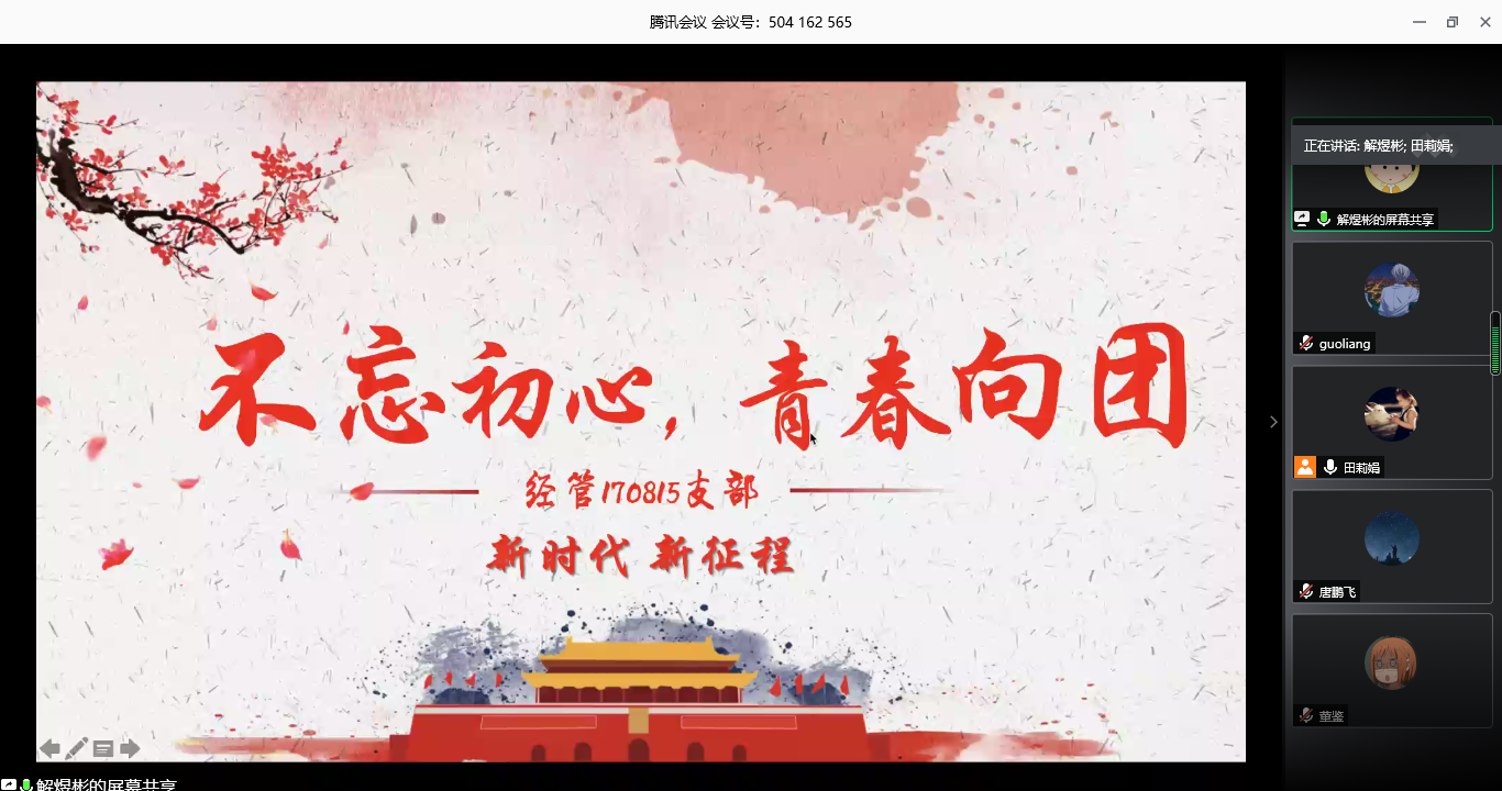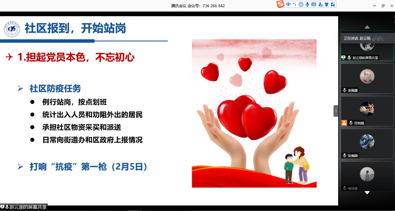 1708党支部“青春抗疫,与国同航”主题党日顺利举行2020年5月27日(星期三)下午四点,“青春抗疫,与国同航”主题学习日活动顺利举办。本次学习日活动的主讲人是员工处“青春抗疫,与国同航”宣讲团成员,采用腾讯会议线上直播形式开展,1708党支部全体成员参加了此次活动。党委委员秦中峰老师列席会议。来自电子信息工程公司的赵云朋同志拉开了宣讲的序幕,赵云朋同志向大家讲述了自己在疫情期间的社区防疫工作...
