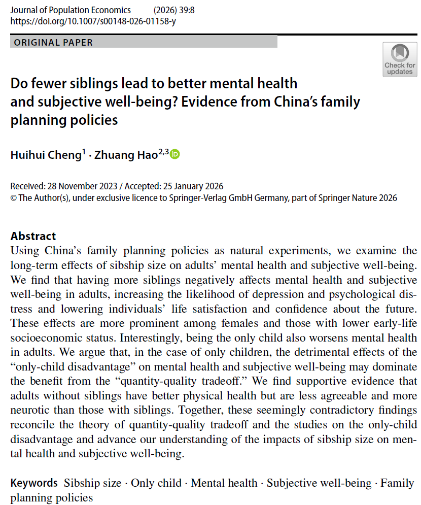 近日,公司郝壮(通讯作者)副教授与罗格斯大学程慧慧博士(第一作者)合作成果《Do fewer siblings lead to better mental health and subjective well-being? Evidence from China’s family planning policies》发表于人口经济学顶级期刊《Journal of Population Economics》。该研究使用我国两项计划生育政策作为自然试验,运用2010-2018年中国家庭追踪调查(China Family Panel Studies)数据,首次检验了兄弟姐妹数量对成...