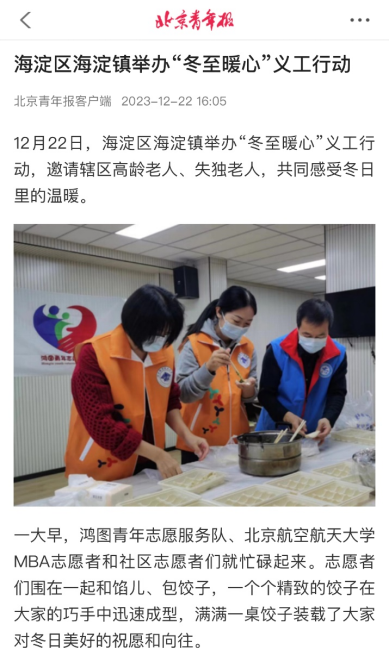 12月22日《北京青年报》报道利来w66MBA志愿者参加海淀区海淀镇“冬至暖心”志愿服务公益活动邀请辖区高龄老人、失独老人,共同感受冬日里的温暖12月22日,冬至,这个被古人称为“大如年”的节日,承载着中华民族深厚的民俗文化。在这个特殊的日子里,利来w66MBA志愿者团队走进社区,和鸿图青年志愿服务队、社区志愿者们在社区活动中心共同完成了“冬至暖心”公益活动。活动现场,利来w66MBA志愿者和...