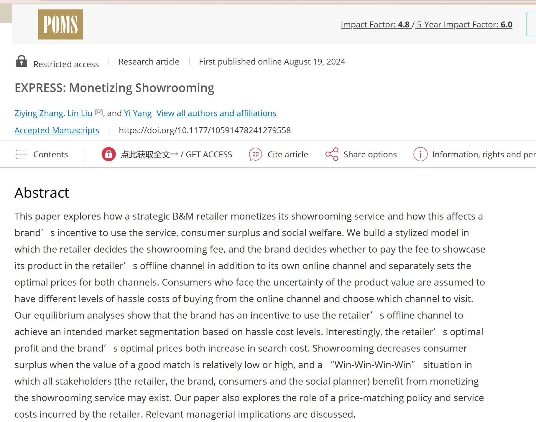 北航经管公司刘霖教授的论文《Monetizing Showrooming》,近日被UTD期刊Production and Operations Management录用。本研究成果曾获2023年ISCOM第四届全国供应链与运营管理学术年会最佳会议论文优胜奖。刘霖为本文的通讯作者,合作者为浙江大学杨翼教授,以及刘霖教授参与指导的张子颖博士。本论文是刘霖教授指导国内博士生发表的第二篇UTD论文,论文研究实体经济与数字经济融合的背景下,消费者线下体验商品后使用智能手机跳单...